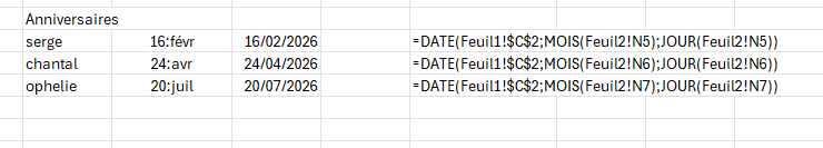 Alors j’ai actualisé la date de naissance de la feuille 2 pour l’adapter à l’année en cours en rajoutant une colonne.