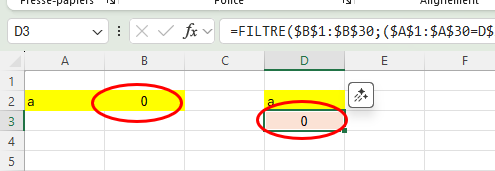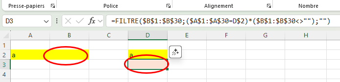 =FILTRE($B$1:$B$30;($A$1:$A$30=D$2)*($B$1:$B$30<>"");"")