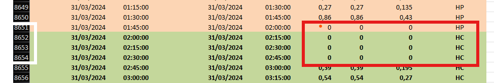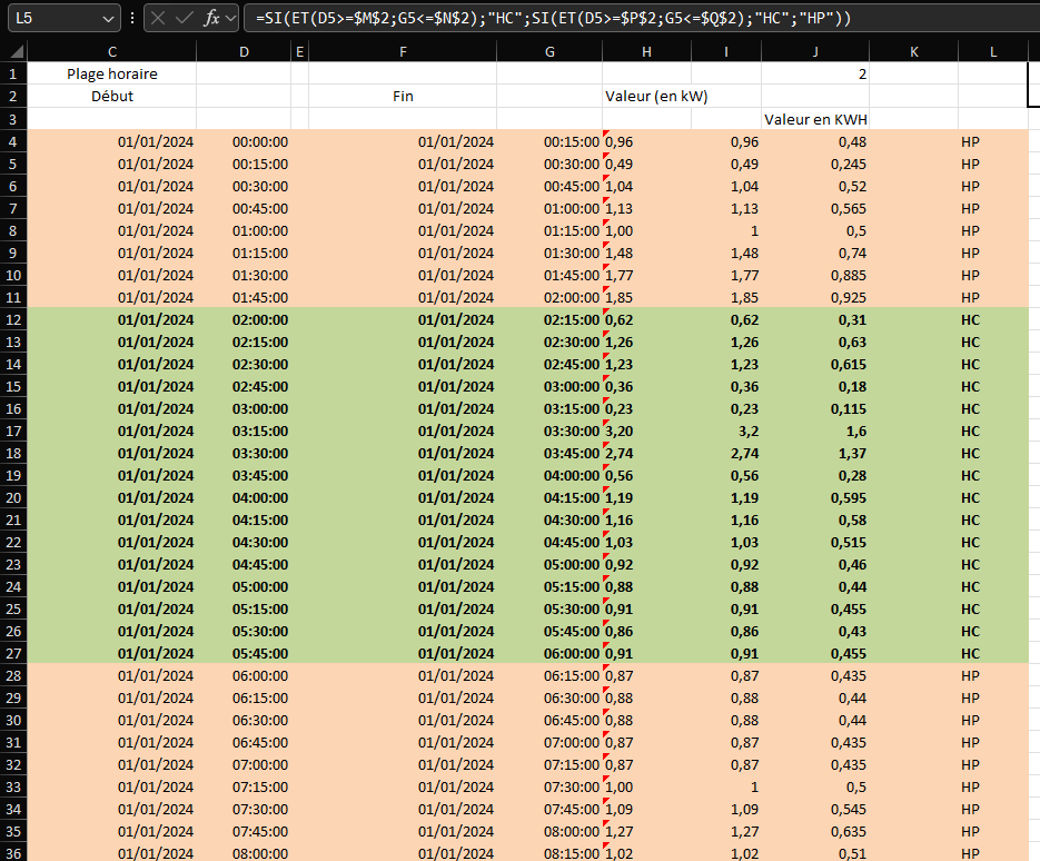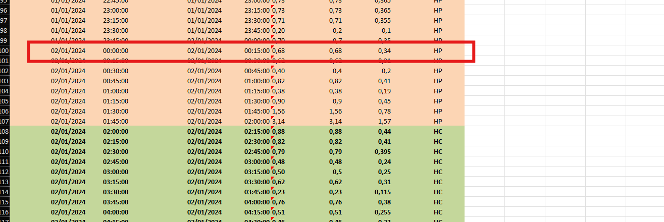 Normalement kWh est une quantité consommée par un appareil en 1 heure, donc dans ton fichier, il faut le laisser et non diviser par deux puisque par exemple par tranche de 15 minutes, tu auras consommé bien les 0.68 kW si je prends la ligne qui est encadrée dans ma capture d’écran au-dessus