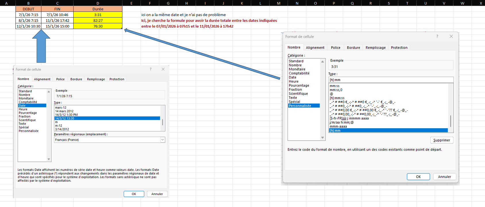 Je sollicite votre aide sur le calcul des heures effectuées entre deux dates différentes.
