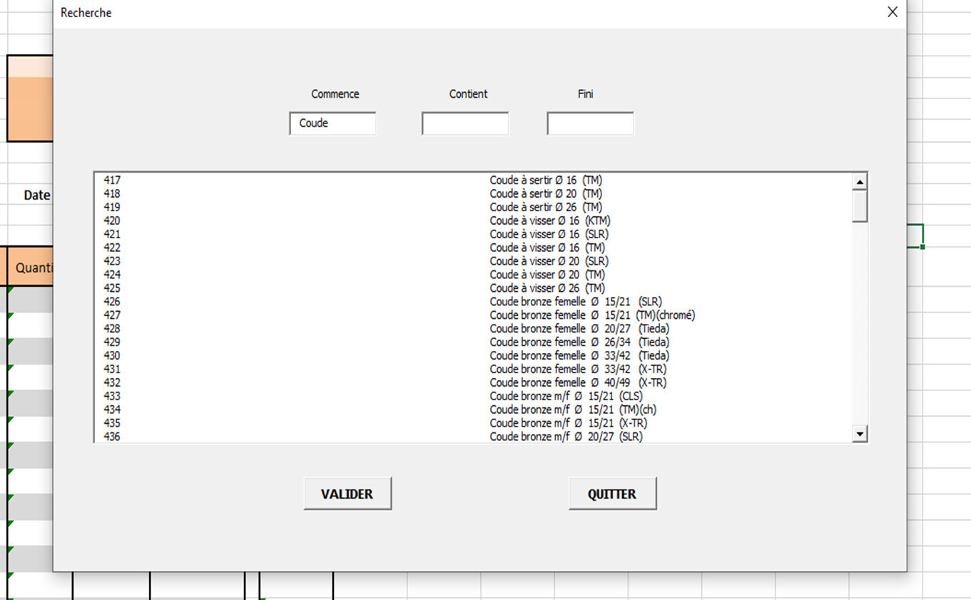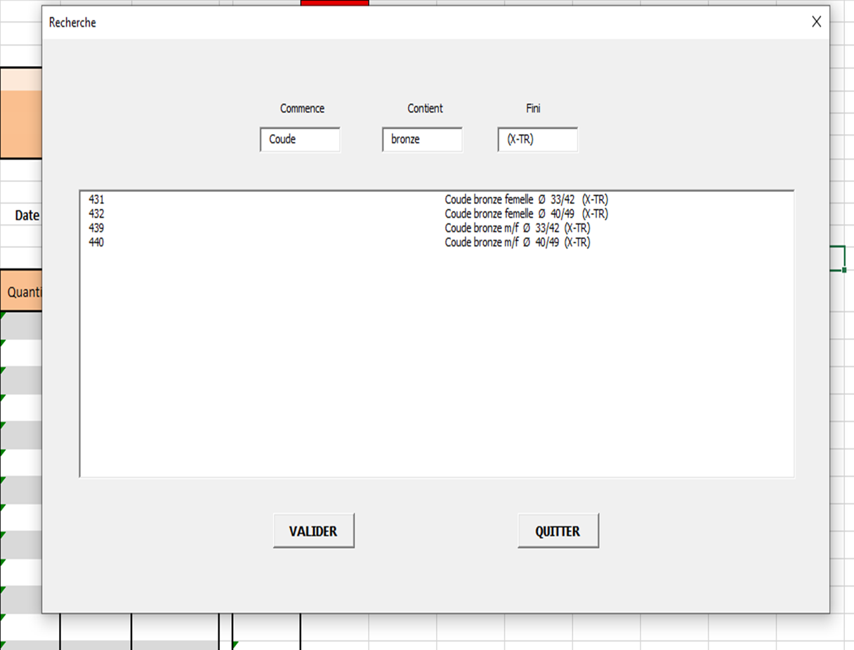 J’affine cette liste en mettant ensuite dans la fenêtre fini « (X-TR) » j’obtiens tous les articles commençant par « Coude » et qui contiennent « Bronze » et se terminant par (X-TR) :