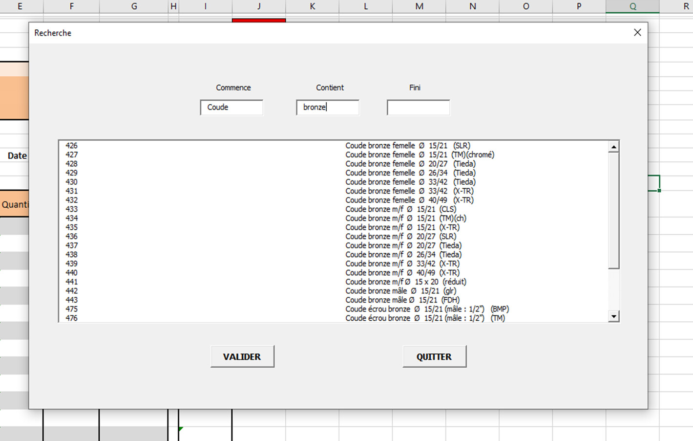 J’affine cette liste en mettant ensuite dans la fenêtre contient « bronze » j’obtiens tous les articles commençant par « Coude » et qui contiennent « Bronze » :
