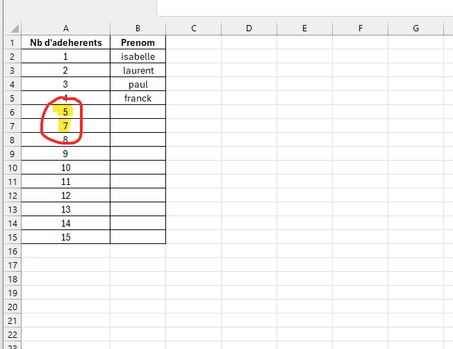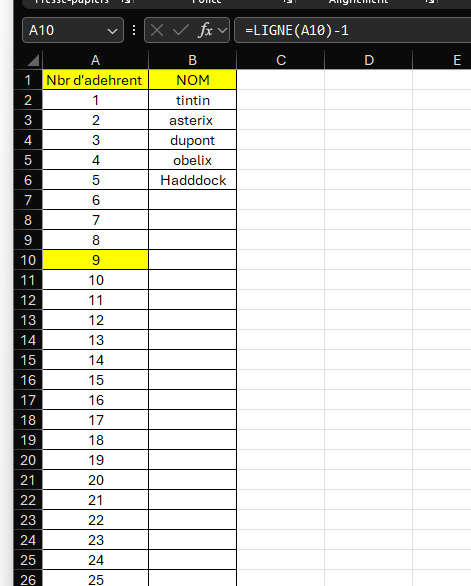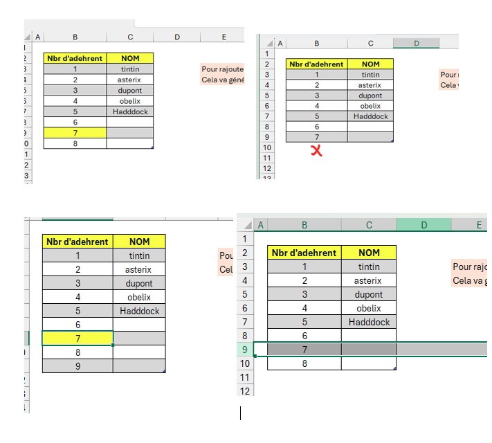 Pour la suite de nombre je sais comment faire! mais je voudrais que quand je supprime une ligne d’un adhérent, il y a toujours la suite de nombre qui s’affiche sans que ca supprime un chiffre de la suite . (voir image)