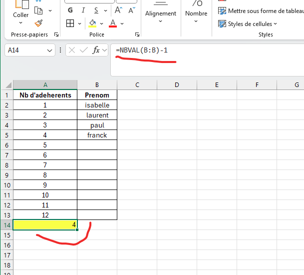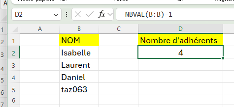 La formule NBVAL(B:B)-1 est a mettre dans une colonne autre que A ou B : elle compte les cellule non vides et avec le -1 on enlève l’intitulé de la colonne.