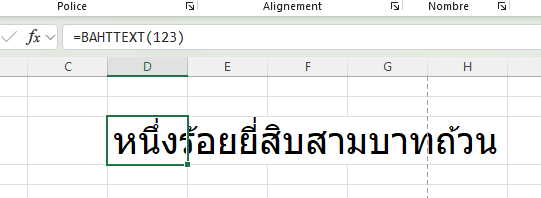 “Convertit un nombre en texte en langue thaï et ajoute le suffixe « Baht »”