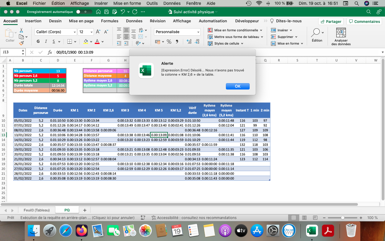 Il me faudrait le rythme moyen en KM 5, KM 5,25 et le rythme pour les autres distances d’où ma modif et je pense que le bug vient de là. En plus enlever 2,6 et 5,2 et je souhaitais si possible intégrer en ligne 6 par ex. le rythme total toutes distances confondues .