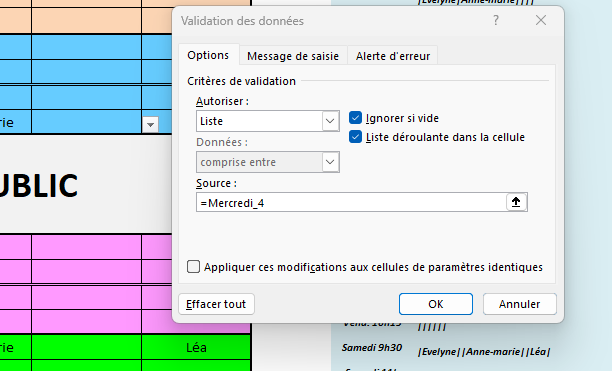 et là, tu renseignes =Mercredi_4 c’est le nom donnée a la plage de données du tableau concernant cette tranche horaire, chaque liste déroulante pour chaque tranche horaires porte le nom de ladite tranche :