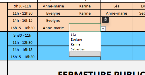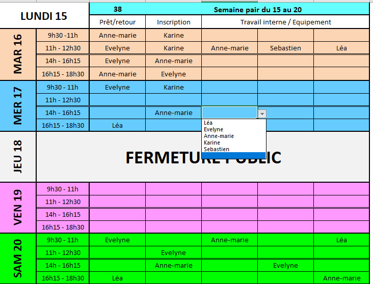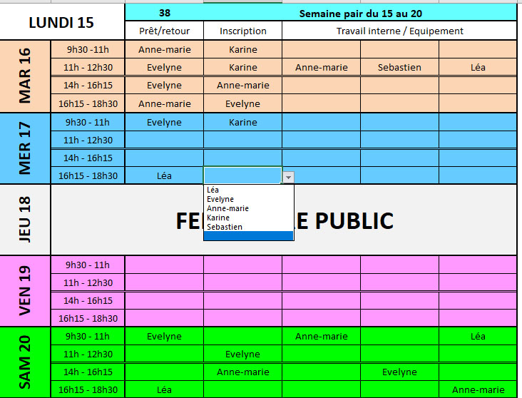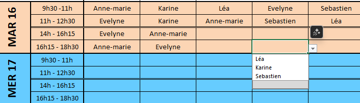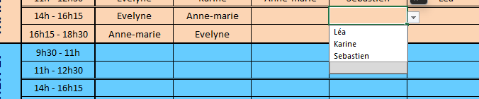 le détail c’est que lorsque “Léa” est sur le créneau de 9h30 en “prêt/retour” il ne faut plus qu’elle apparaisse dans la liste déroulante des autres cellules de la même ligne "inscription”, “travail interne”.