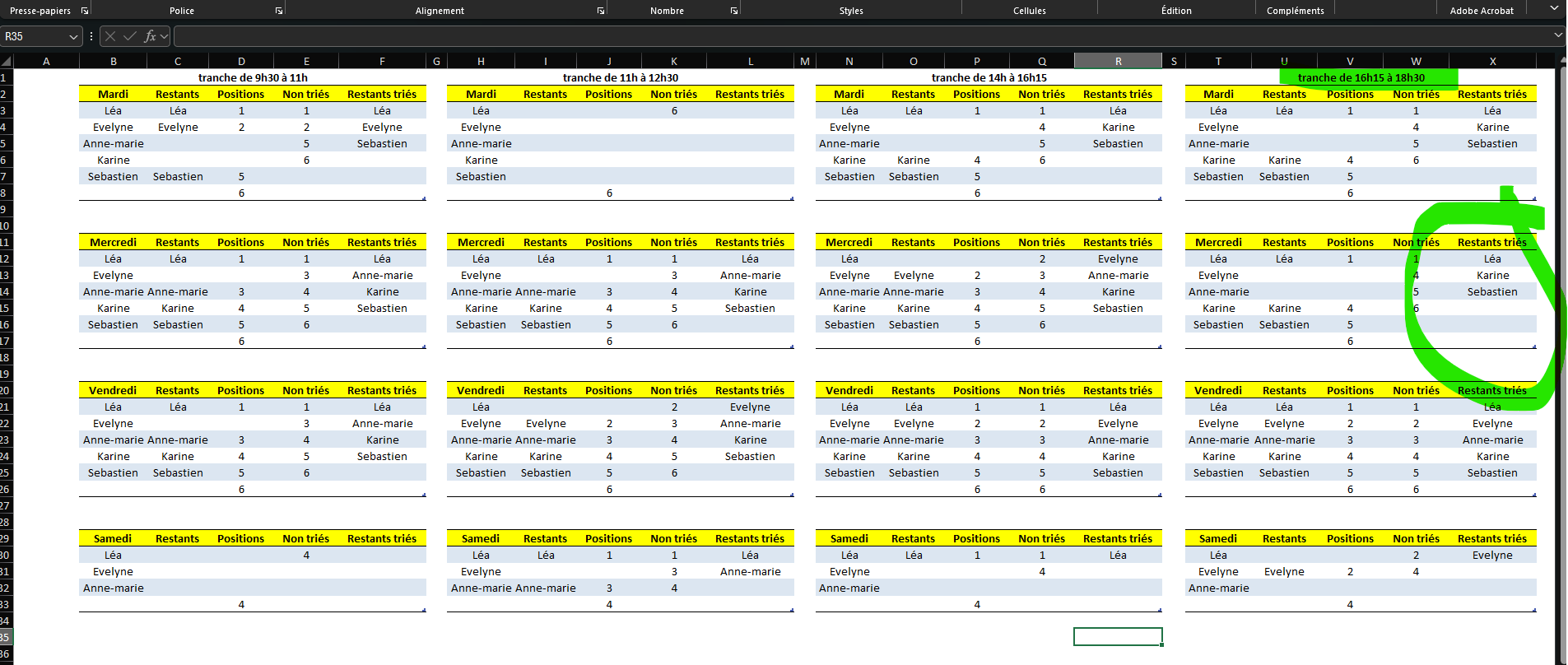 dans l’onglet “personnel” les prénoms doivent apparaitre dans chaque créneaux horaires et disparaitre lorsqu’il sont mis dans l’onglet planning.