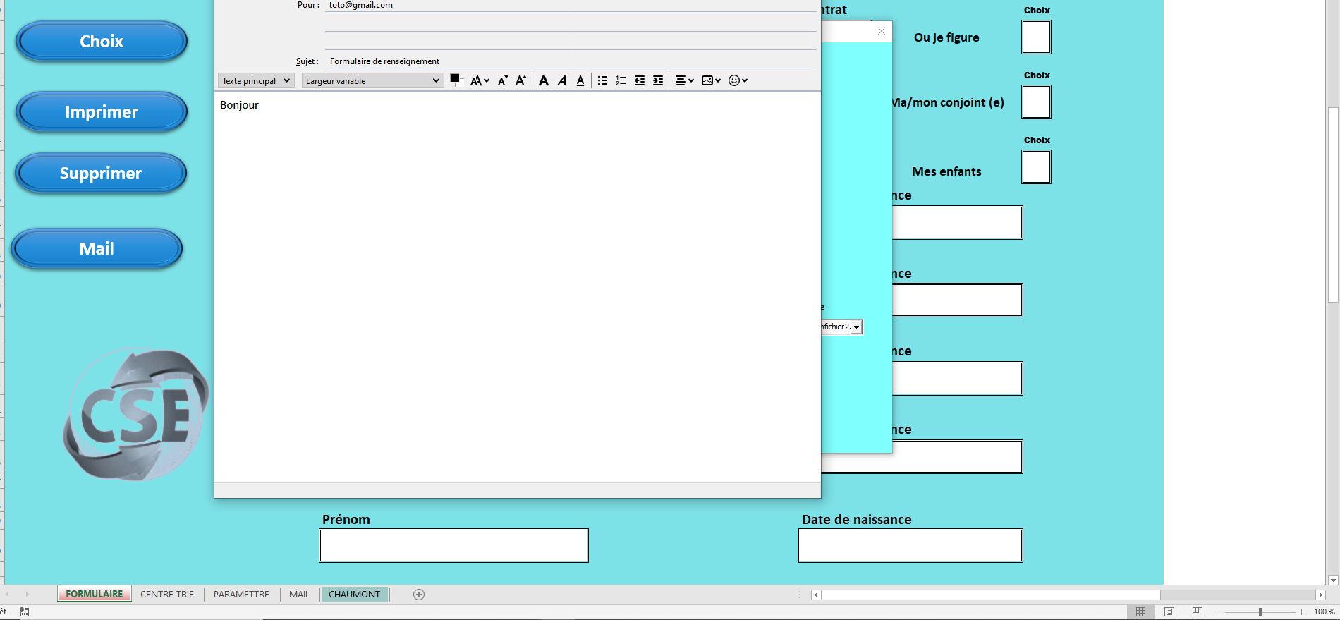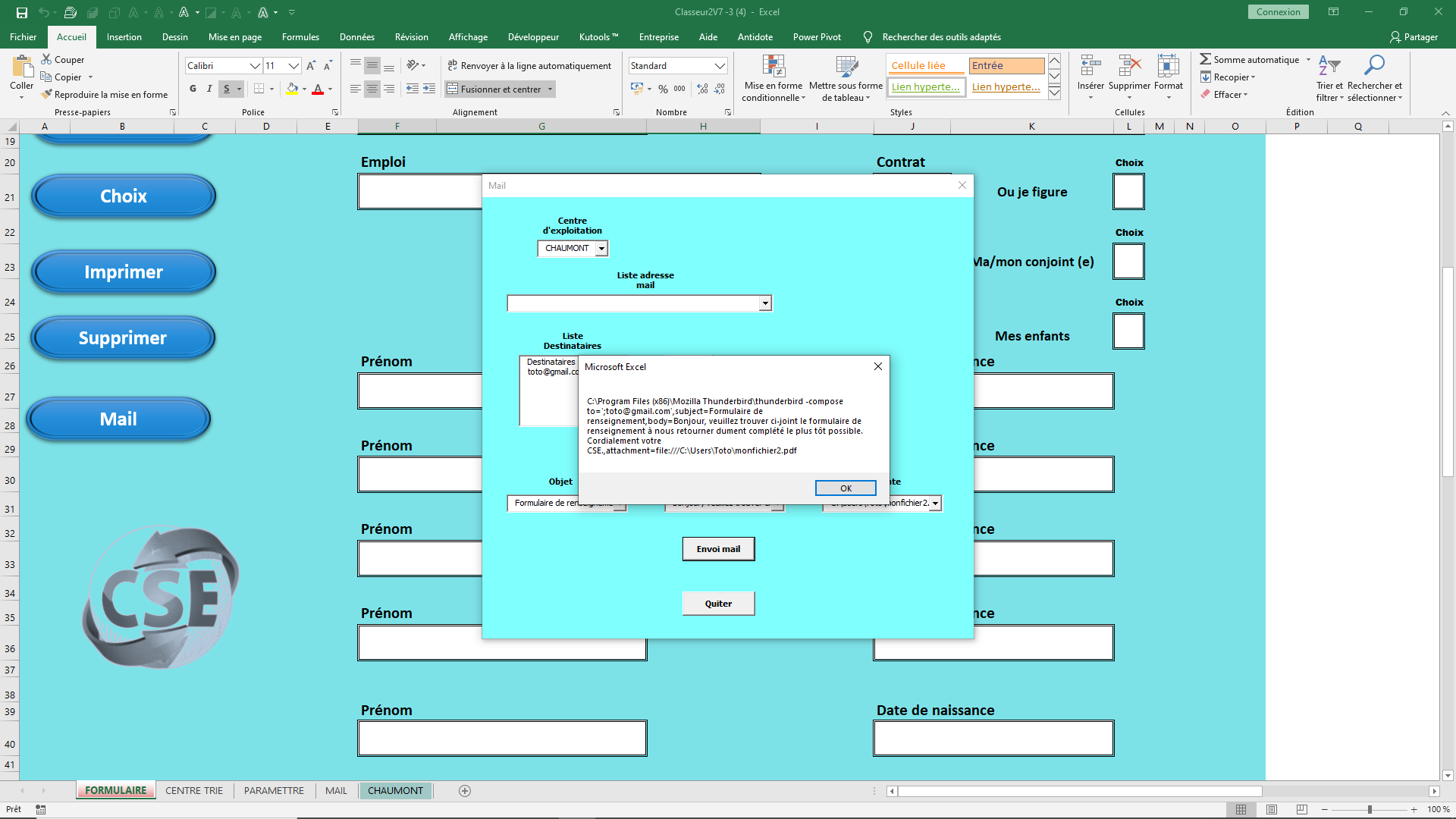 Difficile dans ce contexte d’apporter une amélioration et si tu récupères l’adresse de messagerie dans la BDD tu peux réaliser la même opération dans l’onglet « FORMULAIRE » après avoir choisi la personne dans le centre approprié sont adresse mail s’inscrira dans la fenêtre « Adresse Mail »
