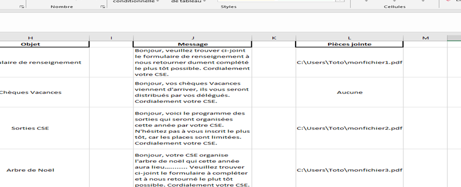 Colonne F H J L respectivement les adresses des destinataires l’objet du mail le message du mail les pièces jointes du mail