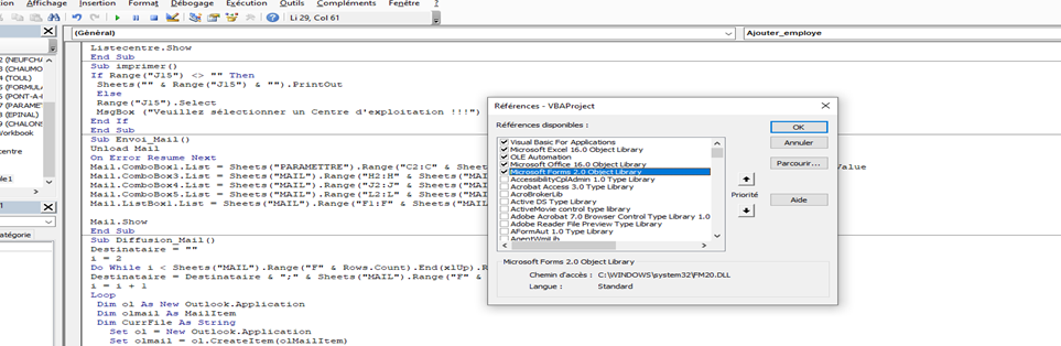 choisir et cocher la référence Microsoft Outlook Library la plus récente (indice le plus haut si plusieurs choix possible)