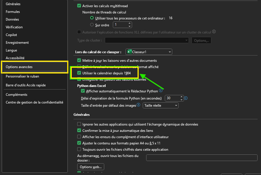 et dans les options avancé cocher la case utiliser le calendrier à partir de 1904