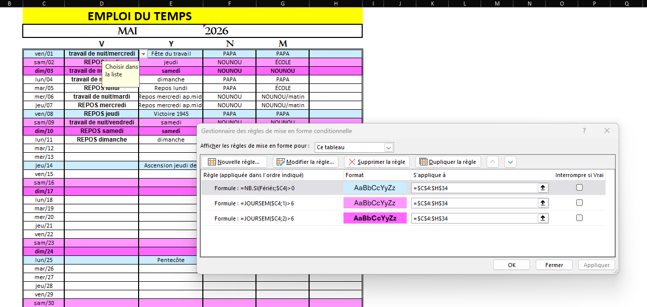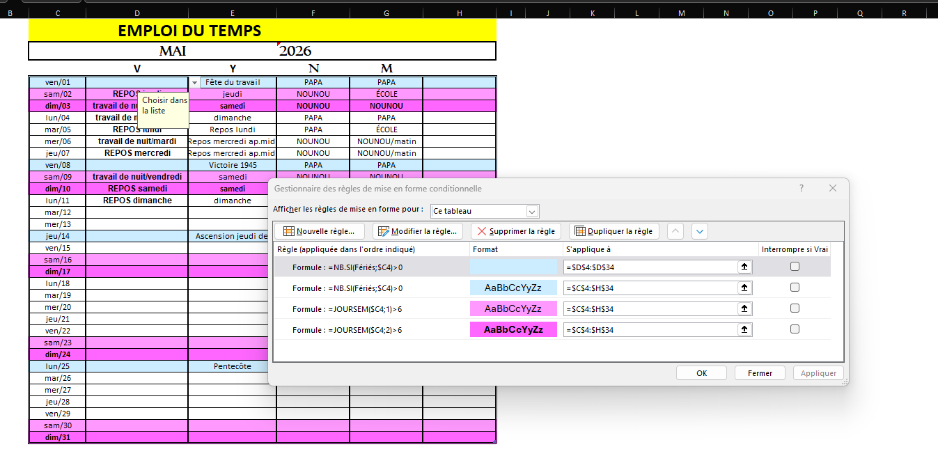 Pourquoi le choix de la colonne D n’apparait plus les jours fériés ? ma fille peut travaillé même les jours fériés.