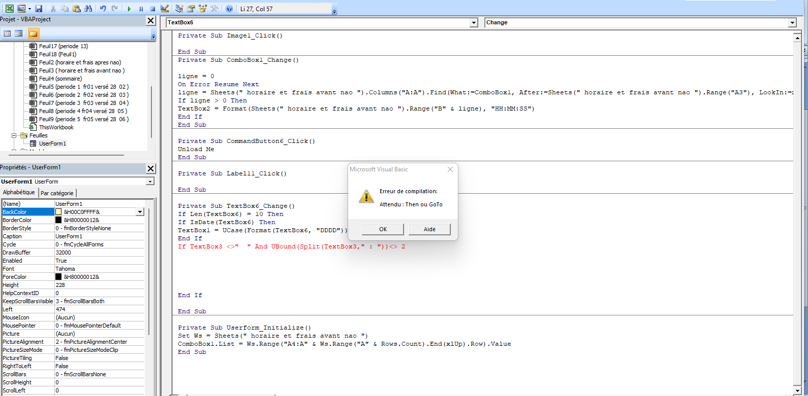 If TextBox3 <> « » And UBound(Split(TextBox3, « : »)) <> 2 Or TextBox4 <> « » And UBound(Split(TextBox4, « : »)) <> 2 Or TextBox5 <> « » And UBound(Split(TextBox5, « : »)) <> 2 Then
