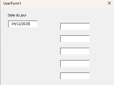 Avec un clic sur le bouton USF on peut appeler le UserForm1. Dans les textbox 2 à 6 s’affiche normalement des données qui se trouvent dans la colonne IND2 du TS Tab_1 de l’onglet PARAMETRES.
