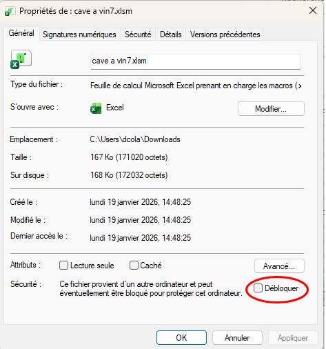 Mise en place : une fois le classeur téléchargé, il faut aller dans l’explorateur de fichiers, faire un clic droit sur le classeur et cliquer sur “Propriétés”. Dans les propriétés, il faut cocher la case “débloquer” :