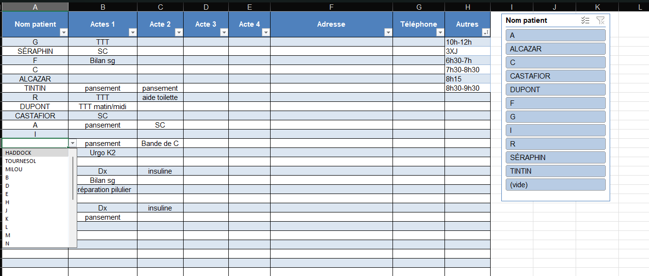 je t’ai créé une liste déroulante qui se réduit au fur et à mesure que tu les sélectionnes dans la colonne Nom Patients, aux patients qui ne sont pas encore dans ta liste