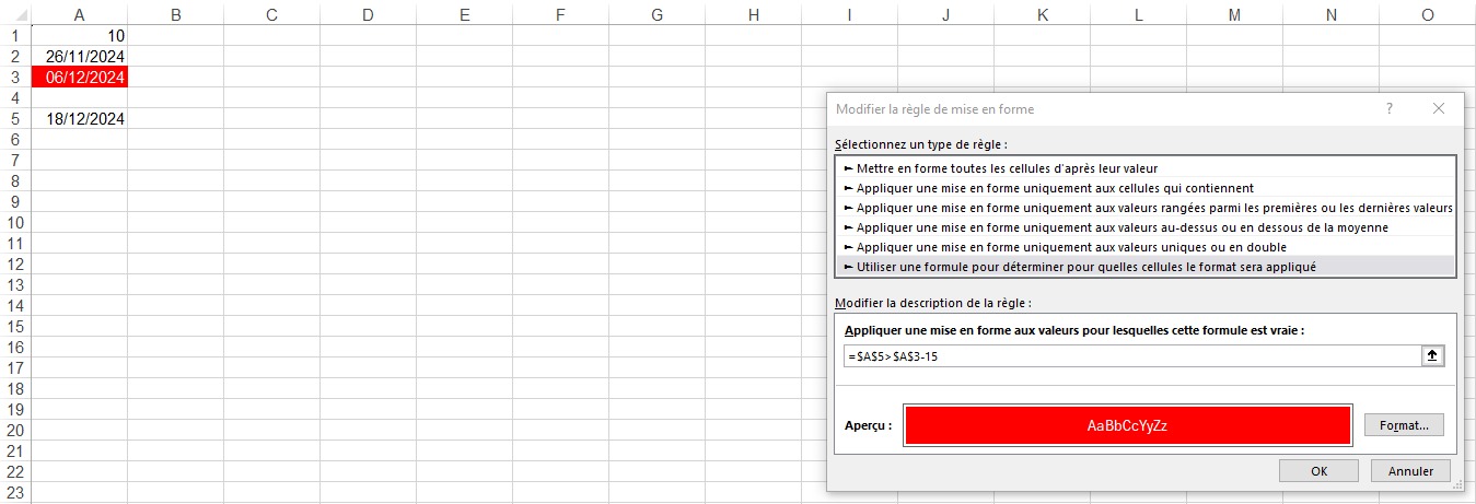 Je voudrais faire une mise en forme conditionnelle de telle manière que la cellule A3 soit rouge si la date du jour est supérieure à A3-15 jours … càd dans mon exemple que la cellule soit rouge à partir du 11/12/2024