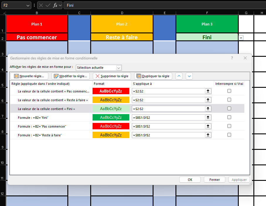 J’aimerais avec ce tableau, que si dans B2 il ya noté « reste à faire » la cellule du dessus (B1) passe en jaune et ainsi de suite si en D2 c’est noté alors D1 passe en jaune…