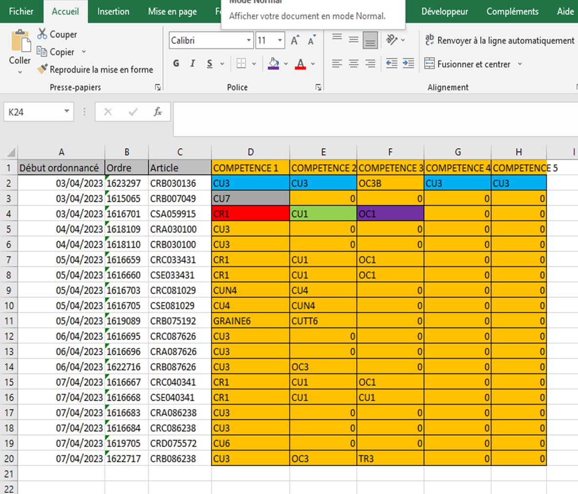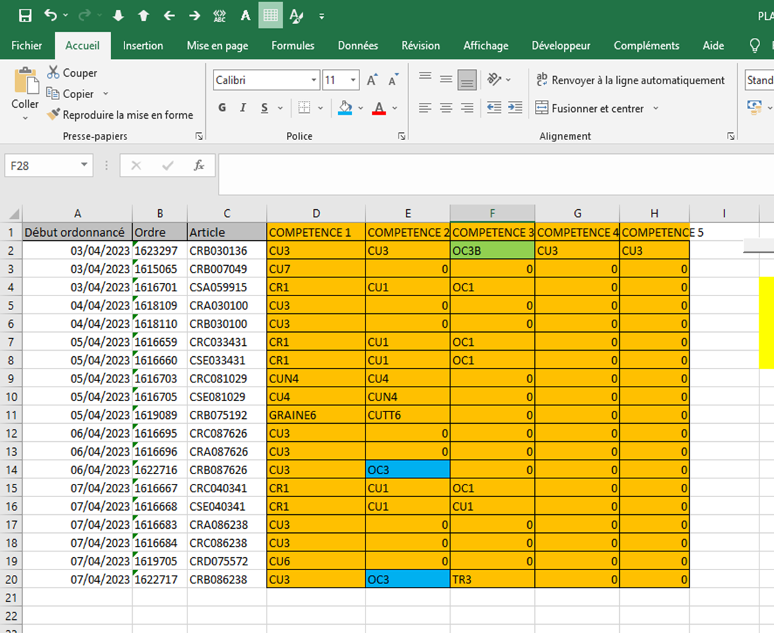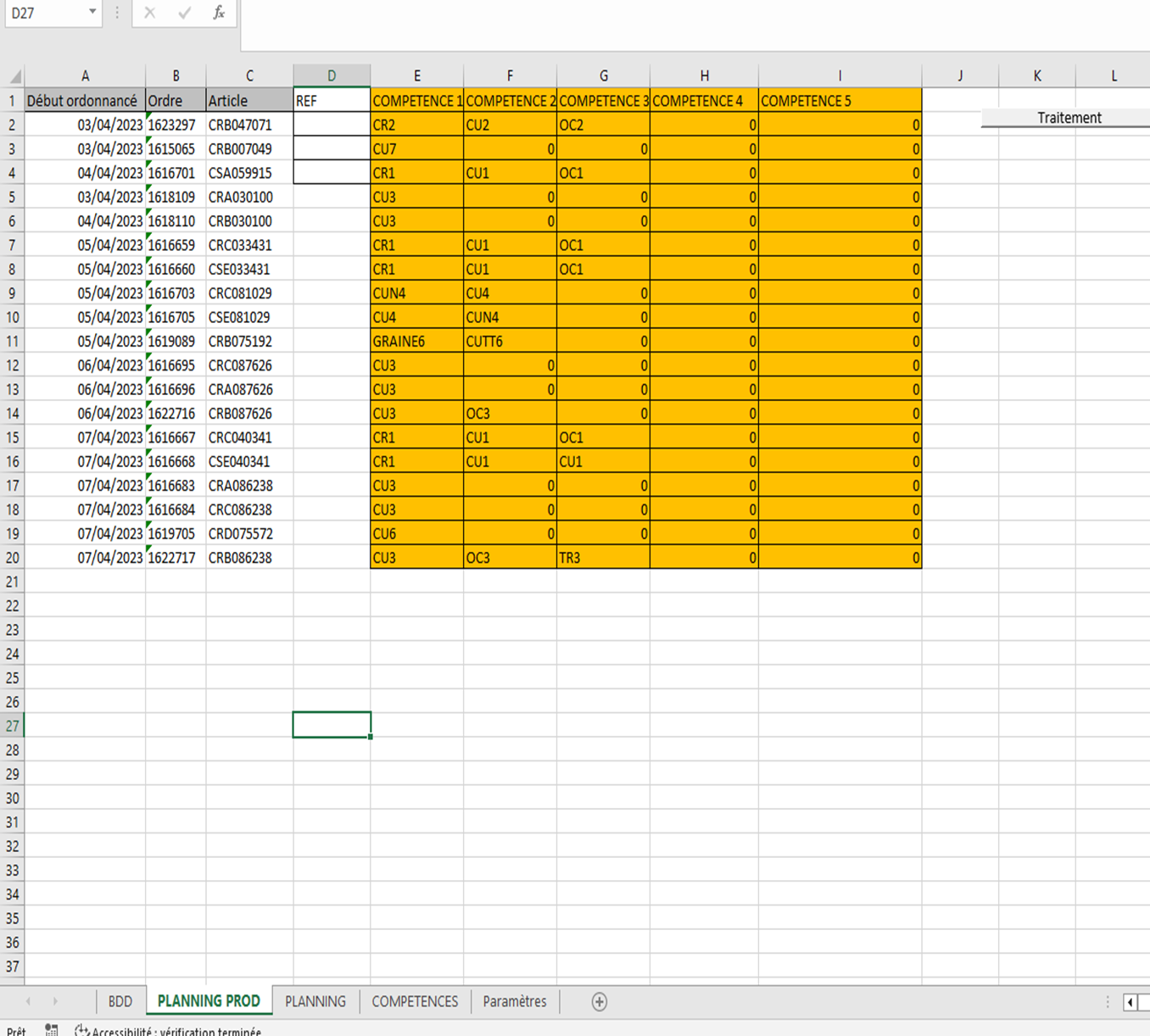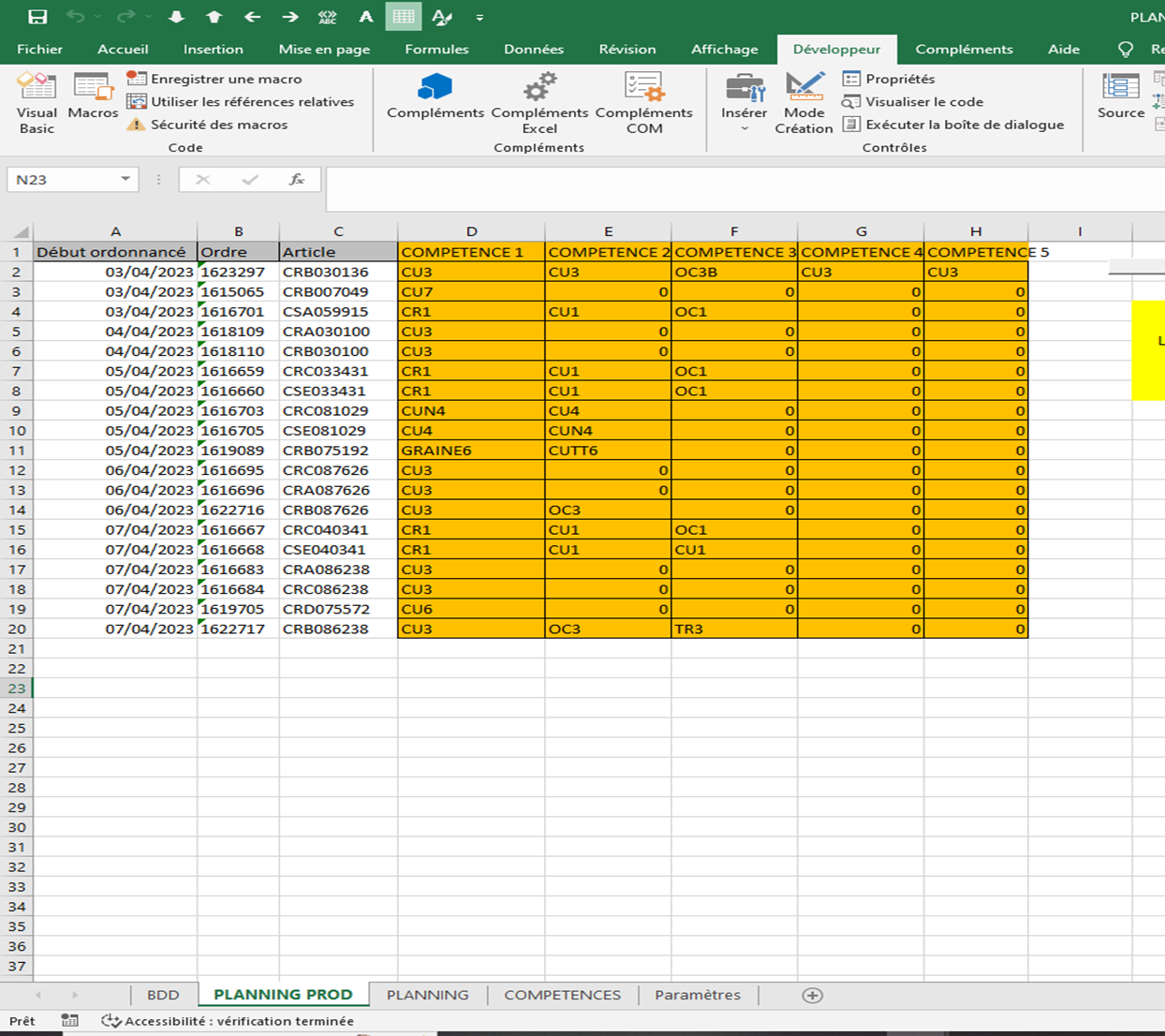 En l’état seules les 3 premières colonnes onglet « PLANNING PROD » sont traités car les 2 supplémentaires sont non intégrés pour chaque jour dans l’onglet « PLANNING »