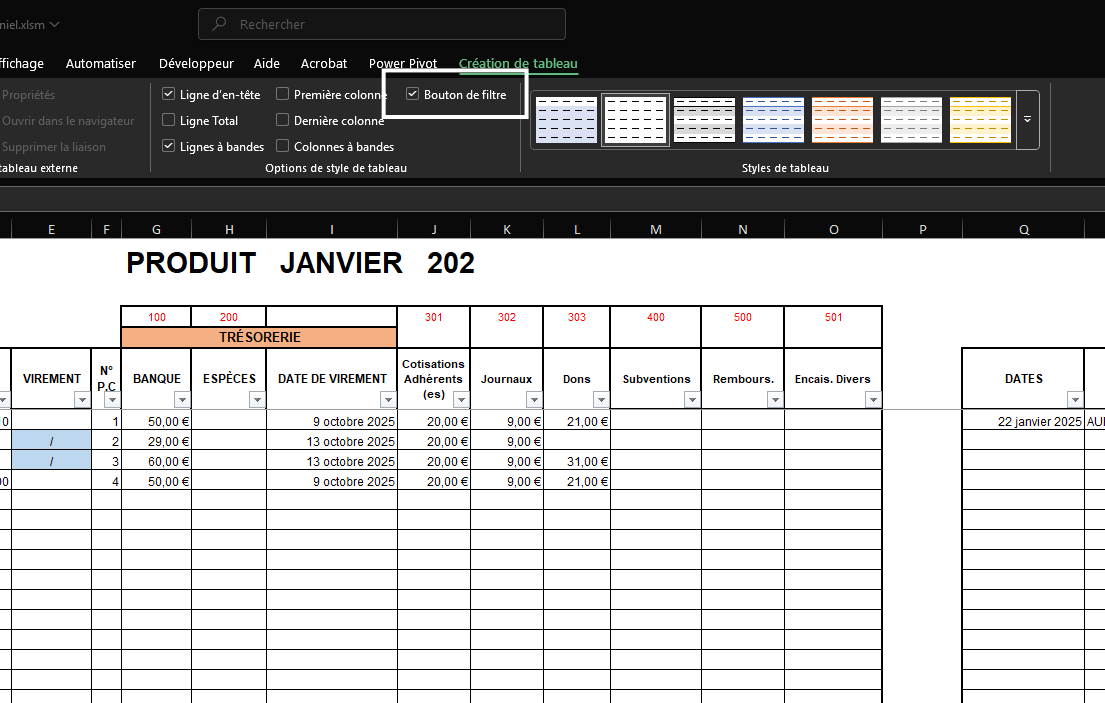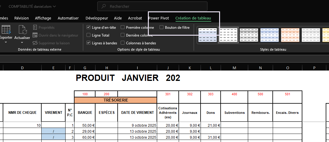 Le tableau que j’ai mis en pièce jointe, est issu d’un tableau vierge que je me sers d’année en année en changeant juste l’année. La structure est toujours la même. Seul change les dates et l’ordre d’arrivée pour les paiements en produits ou en charges. Car bien sûr, les adhérents ne paient à la même date d’année en année. Lorsque je prends le fichier vierge, je mets l’année en cours et je fais ”Enregistrer Sous” dans un autre dossier de mon association. Ceci afin d’avoir les archives par années, et éviter d’effacer tous les mois pour avoir à nouveau un fichier vierge.
