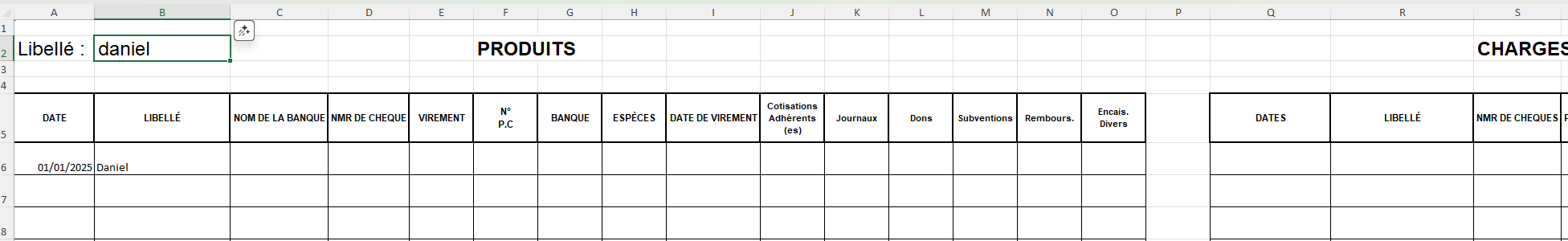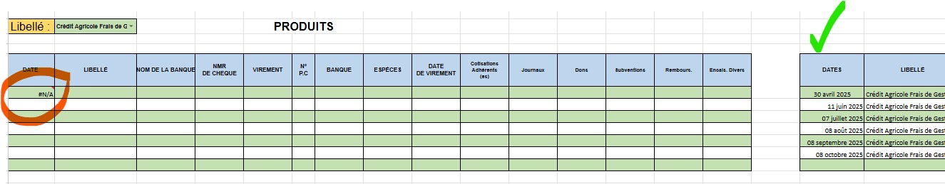Par contre j’ai cela dans une des colonnes où se trouvent les formules (dans les dates) dans les produits ou les charges lorsqu’un adhérent n’a pas fait d’opération dans l’une ou l’autre des catégories. Pareil si en Produits c’est ok en Charges j’ai cette erreur d’inscrite. Possibilité de le rendre invisible ? Ce n’est pas important en soit je le reconnais.
