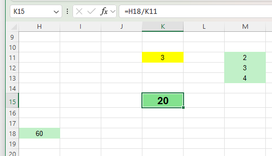 Faire le calcul de la case H18 DIVISER par une des cases M11 a M13