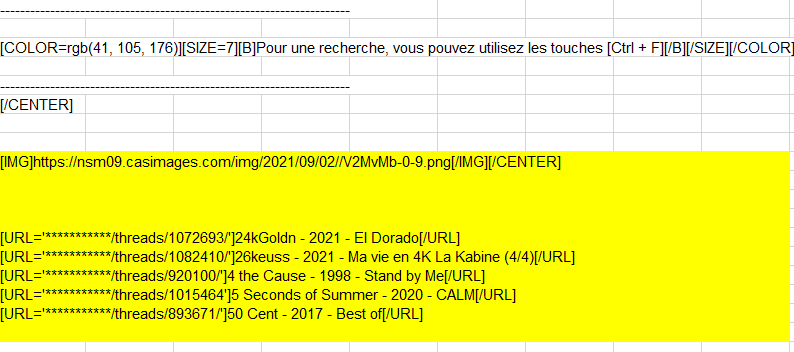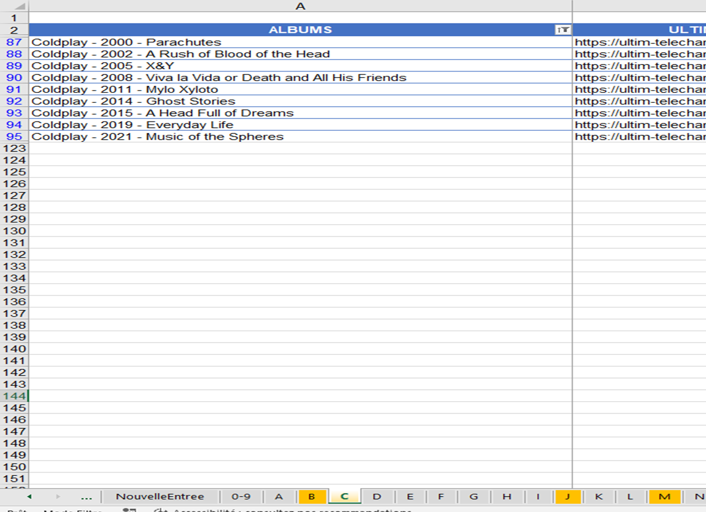 Dans ce tableau je voudrais que quand je tapes des données dans la colonne F, qu’il me retrouve dans toutes les feuilles le nom de l’album correspondant.