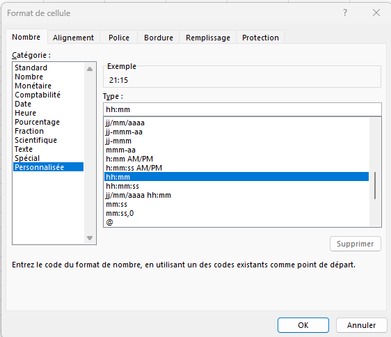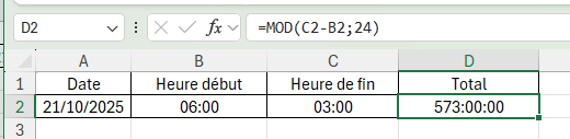 Non pas. Avec le format “hh:mm:ss”, tu n’affiches que les décimales, c’est à dire que 0,89. Si tu mets le format “[h]:mm:ss”, tu vas afficher le nombre d’heures total, soit 573.Le résultat n’est qu’apparemment correct. Si Philou418 additionne les heures du mois, il va être étonné.