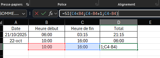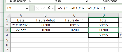 Comment faire pour que le calcul d’heures se fasse automatiquement sans devoir faire une ligne supplémentaire ( en gros ne pas devoir faire 21 de 06:00 à 23:59 et 22 de 00:00 à 03:15).
