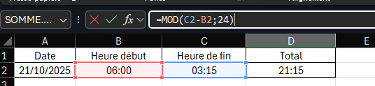 Merci, par contre quand j’essaye alors de faire le calcul des heures pressées sur plusieurs jours je n’arrive pas à avoir le résultat, je suppose qu’il y a une astuce