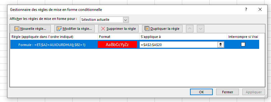 Dans ma colonne A se trouvent des dates (qui sont des échéances de payement). Dans ma colonne B se trouvent des chiffres (1 ou 2). Le 1 = Facture pas payée, le 2= facture payée. Ce que je souhaiterais est que si une facture arrive à échéance est qu’elle n’est pas payée (donc 1 dans la colonne B) alors la date passe en rouge automatiquement et revient en couleur normale quand je passe en « 2 ». Si pas contre elle est en 2 (donc payée) la date ne change pas de couleur.