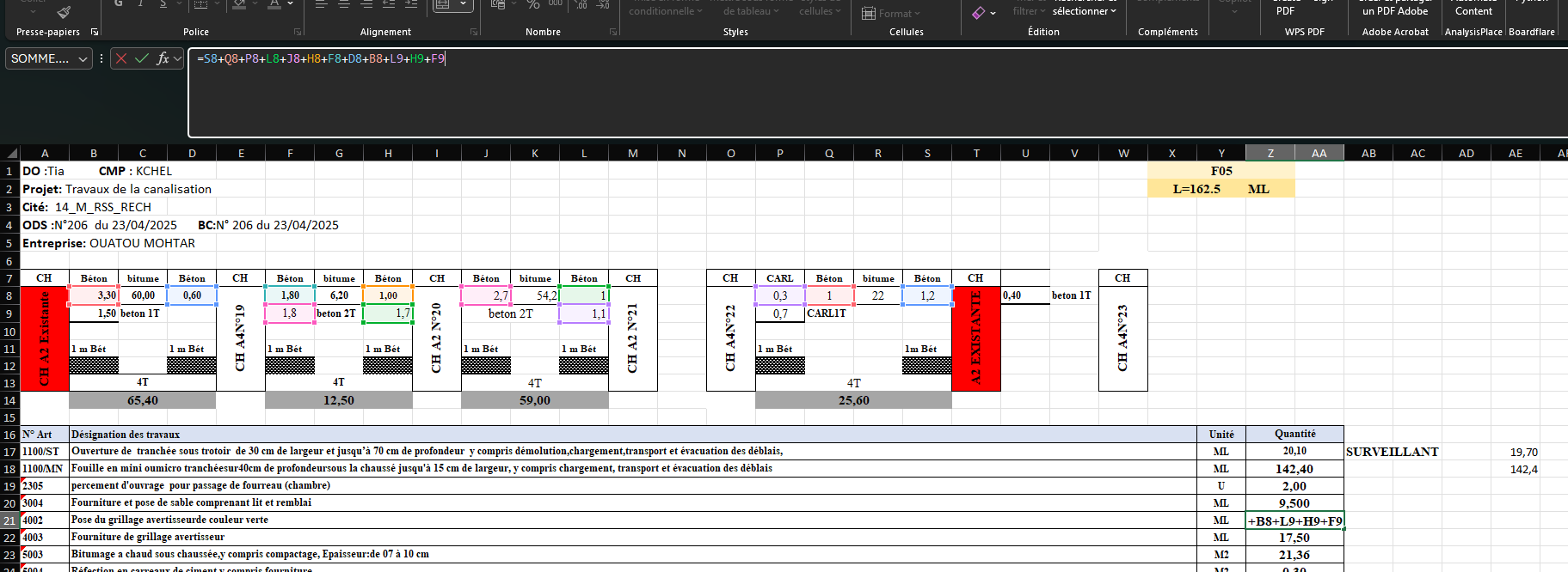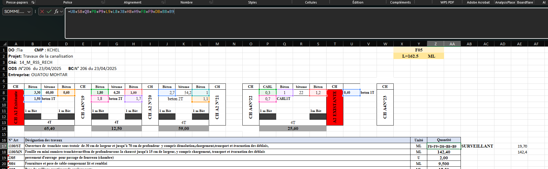 Je cherche une solution, de préférence basée uniquement sur des formules, pour automatiser le traitement d’attachements liés à des travaux de canalisation.